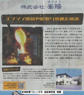 会社名 株式会社峯陽 代表取締役社長 原田 篤 加入団体 長崎県金属工業協同組合、日本鋳造協会全九州銑鉄鋳物工業組合 営業種目 陸舶用原動機及び補機、産業機械等の鋳鉄特殊鋳鉄及び特殊鋳鋼、ステンレス鋳物の製造機械加工